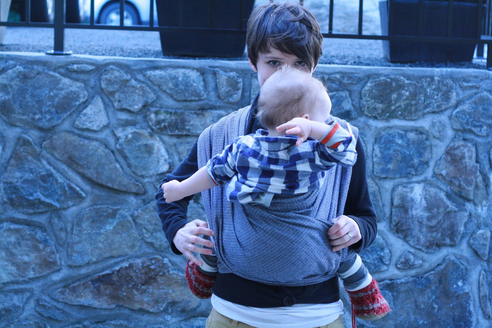 Today I thought a tutorial on one of the first carries people try! So Front Wrap Cross Carry (FWCC) it is! This carry is great for all ages, from newborn to toddler. If you have used a stretchy wrap, it is very similar to how you would have tied it. There are a few variations, some that help for a newborn, some are just a personal thing people do. I am going to do a photo tutorial, but I will link some videos for those that learn better that way and for some variations. Please excuse some awkward faces, we had one go at it with a cranky baby.